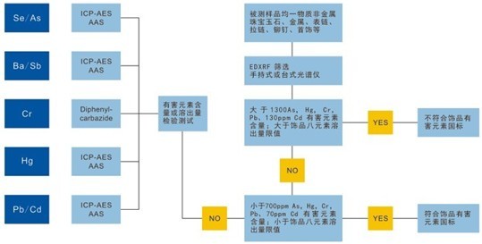 另外XRF由于只是測試元素的總含量,而無法進行溶出量的檢測,我們可以通過XRF測試元素總量是否超過了溶出量最大限量,如果超過溶出量最大限量,則必須通過其他光譜分析檢測設備(如ICP、AAS)來確定元素的溶出量是否超過了最大限量,所以如果要全方位的解決飾品中有害元素檢測解決方案,單只靠XRF是無法全部做到的,還要進行其它分析測試,下圖表示XRF檢測飾品有害元素的篩選性初檢分析方法: