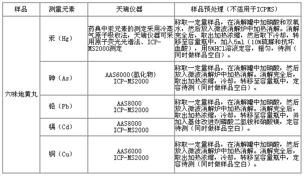 天瑞儀器參考《中華人民共和國藥典》,采用原子吸收光譜儀(AAS6000;AAS8000)、原子熒光光譜儀(AFS200系列)、電感耦合等離子體質(zhì)譜儀(ICP-MS2000),對六味地黃丸中鎘、鉛、銅、砷、砷、汞等重金屬的測定進行研究,測試結(jié)果準確度高,重復性好。
