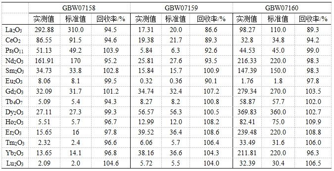 參考《GB/T 40798 離子型稀土原礦化學(xué)分析方法 稀土總量的測定 電感耦合等離子體質(zhì)譜法》,采用氫氟酸、硝酸、高氯酸進(jìn)行濕法消解。利用碰撞反應(yīng)模式控制氧化物產(chǎn)率,降低輕稀土氧化物/氫氧化物對其他稀土元素的干擾;并根據(jù)實(shí)際樣品中元素含量,校準(zhǔn)稀土氧化物/氫氧化物的干擾。對三個(gè)稀土礦標(biāo)準(zhǔn)物質(zhì)中14種稀土元素(以氧化物形式表示)進(jìn)行測試,各元素回收率為86.6 %~109.9%。