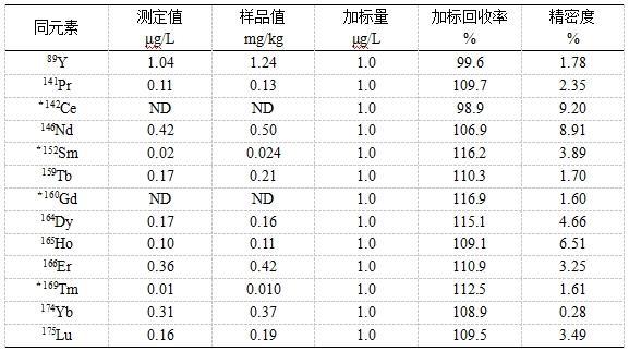 參考《GB/T 18115.1-2020 稀土金屬及其氧化物中稀土雜質(zhì)化學(xué)分析方法 第1部分:鑭中鈰、鐠、釹、釤、銪、釓、鋱、鏑、鈥、餌、銩、鐿、镥和釔量的測定》,將高純氧化鑭用稀硝酸溶解,利用內(nèi)標(biāo)法進(jìn)行校正??疾旒訕?biāo)回收率及精密度。方法加標(biāo)回收率為98.9%~116.9%,精密度為0.28%~9.20%。