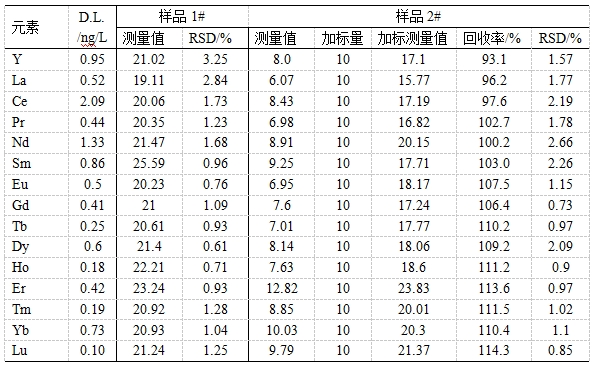 油田稀土示蹤劑主要用來考察油田井間的導(dǎo)通性,具有無放射性、安全穩(wěn)定、用量少、分析精度高等特點(diǎn)。將所得油田水樣搖勻過濾,稀硝酸稀釋一定倍數(shù),以內(nèi)標(biāo)法校正樣品基體對待測同位素影響,考察Y、La、Ce等15種稀土示蹤劑的檢出限、精密度(以RSD表示)、加標(biāo)回收率。發(fā)現(xiàn)檢出限為0.10~2.09ng/L;樣品1#的精密度為0.61%~3.25%;樣品2#中各元素加標(biāo)回收率為93.1%~114.3%,精密度為0.85%~2.66%。