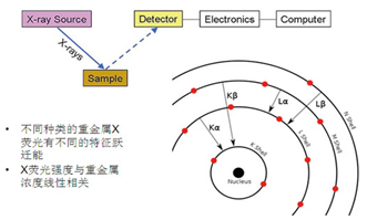 X射線熒光光譜技術(shù)(XRF)的原理見圖3所示,可以直接檢測固體或液體樣品中ppm量級(jí)的元素成分。采用富集后再檢測的辦法,使得XRF技術(shù)對(duì)空氣顆粒物中的重金屬成分的檢測限優(yōu)于0.001ug/m3。而常規(guī)實(shí)驗(yàn)室的檢測技術(shù),由于預(yù)處理消解過程中需要將微克量級(jí)的樣品溶解到幾十克的液體中,而使得濃度被稀釋百萬倍,從而多數(shù)儀器(譬如ICP-AES、或原子吸收光譜儀)無法檢出元素含量低于10ug/m3量級(jí)的空氣顆粒物樣品。