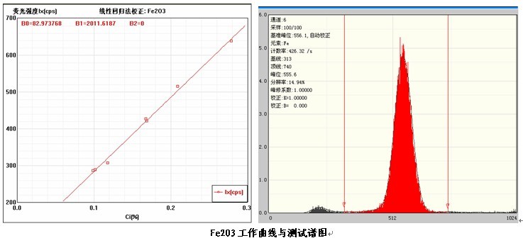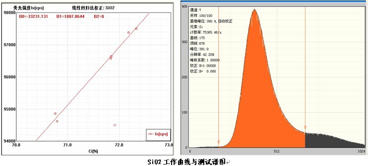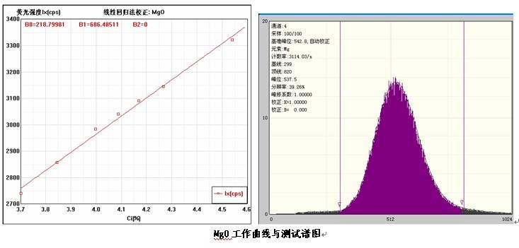 各個(gè)元素的工作曲線與測試譜圖,其中B0為曲線節(jié)距;B1:為曲線斜率;在測試譜圖中有元素的測試信息:計(jì)數(shù)率,采樣時(shí)間,分辨率等。