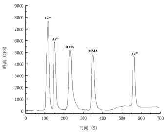 利用LC-ICPMS聯(lián)用測試河水樣品中的五種砷形態(tài),測試結(jié)果表明,該方法檢出限低、線性相關(guān)系數(shù)均在0.999以上,樣品加標(biāo)回收率在87.8%-112.7%之間;同時五種砷形態(tài)能夠在600s內(nèi)完成分析,且分離度較好,此方法可滿足水質(zhì)樣品中砷的形態(tài)分析。